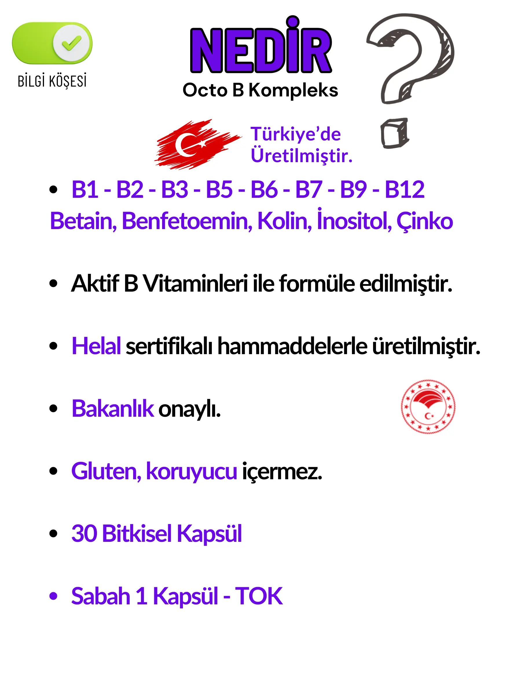 Octo B Kompleks; 5-MTHF, P5P, R5P ve 3 formlu B12 içeriğiyle dengeli ve gelişmiş bir formül sunuyor.