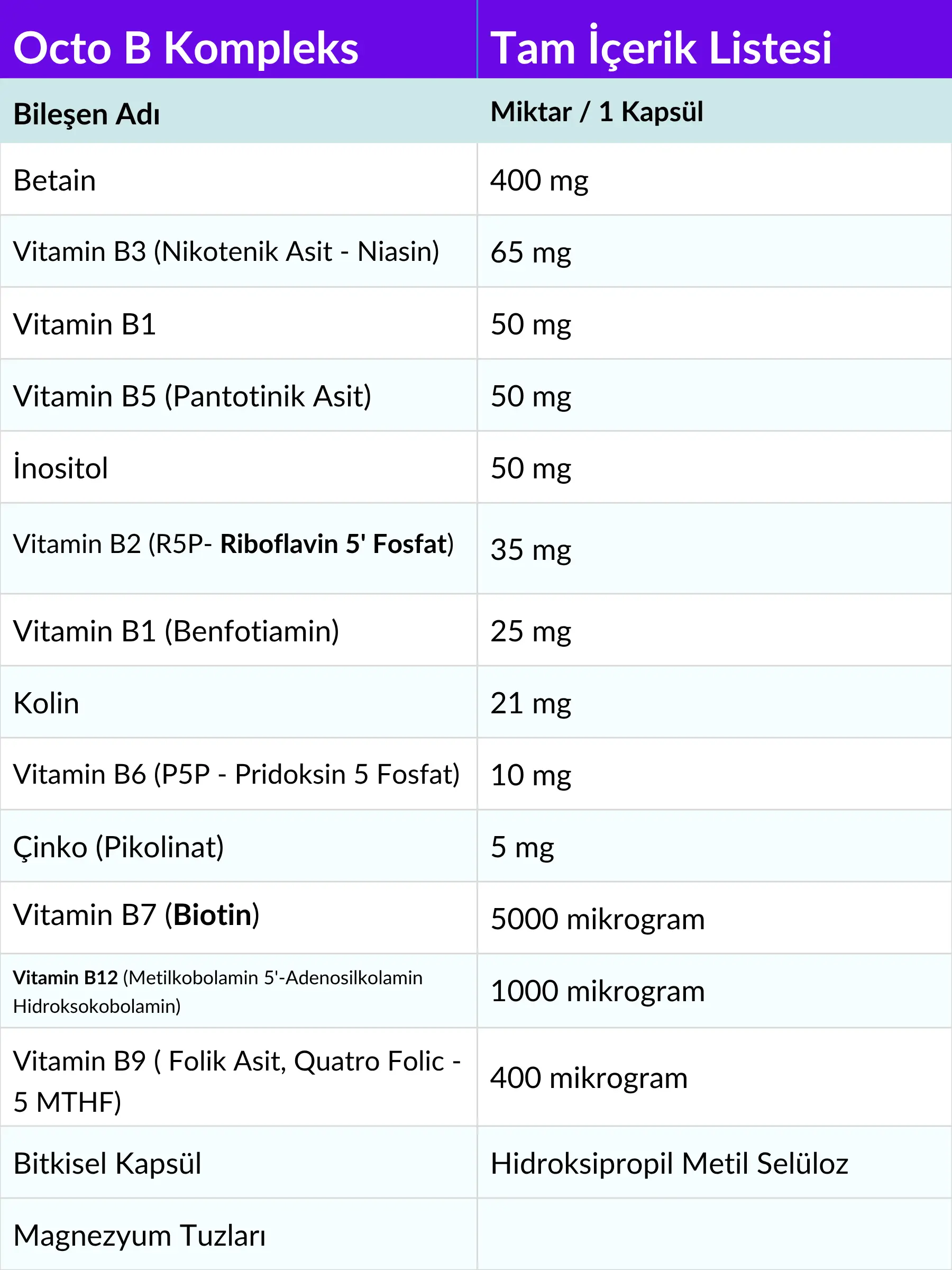B1 (Benfotiamin), B2 (Riboflavin-5-Fosfat / R5P), B3 (Nikotinik Asit), B5 (Pantotenik Asit), B6 (Piridoksal-5-Fosfat / P5P), B7 (Biotin), B9 (5-MTHF – Quatrefolic®) ve B12’nin üç aktif formunu (Metilkobalamin + Adenosilkobalamin + Hidroksokobalamin) içerir.